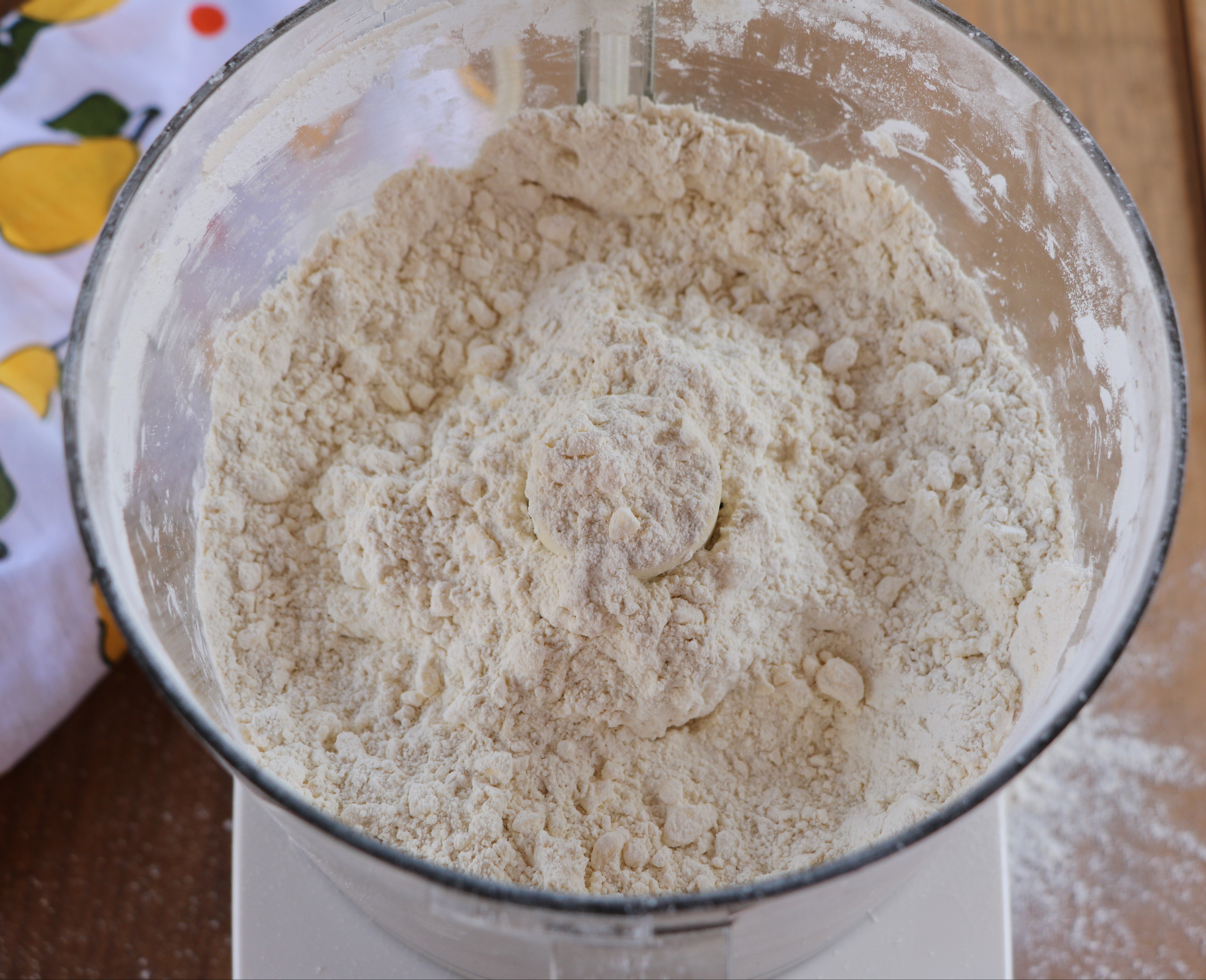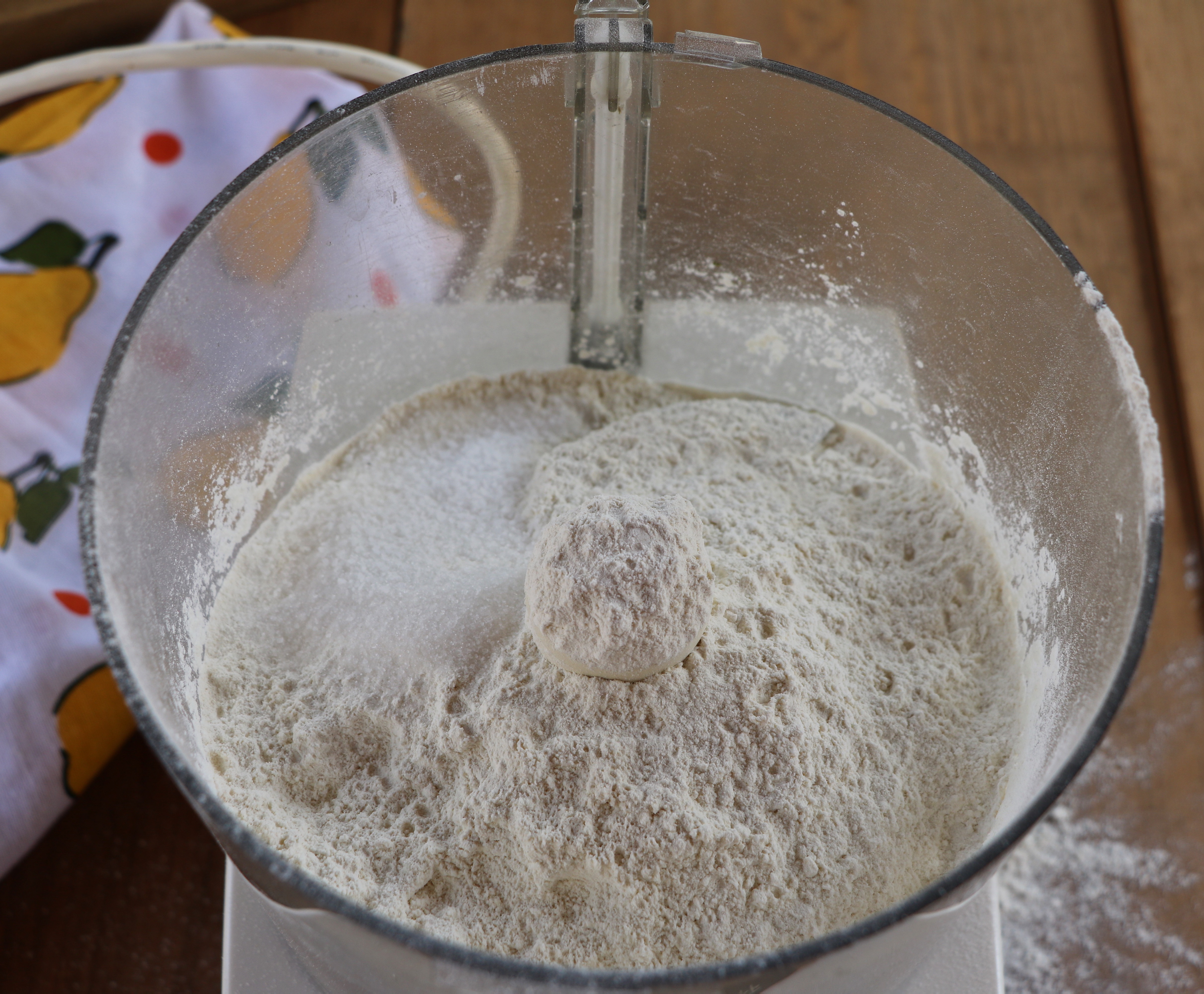 Get the food processor ready to go, and place the self-rising flour, baking soda and salt in the food processor bowl.