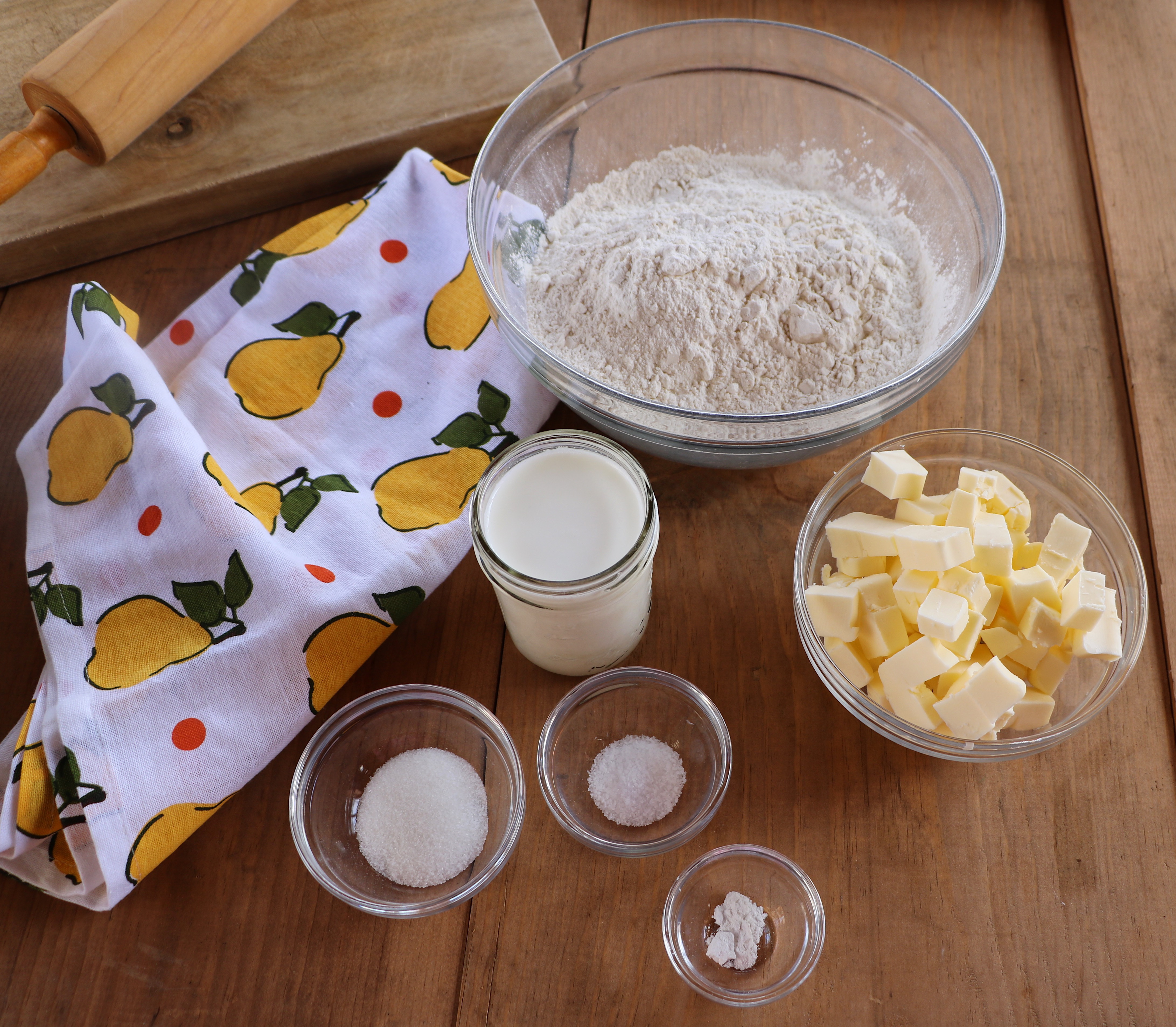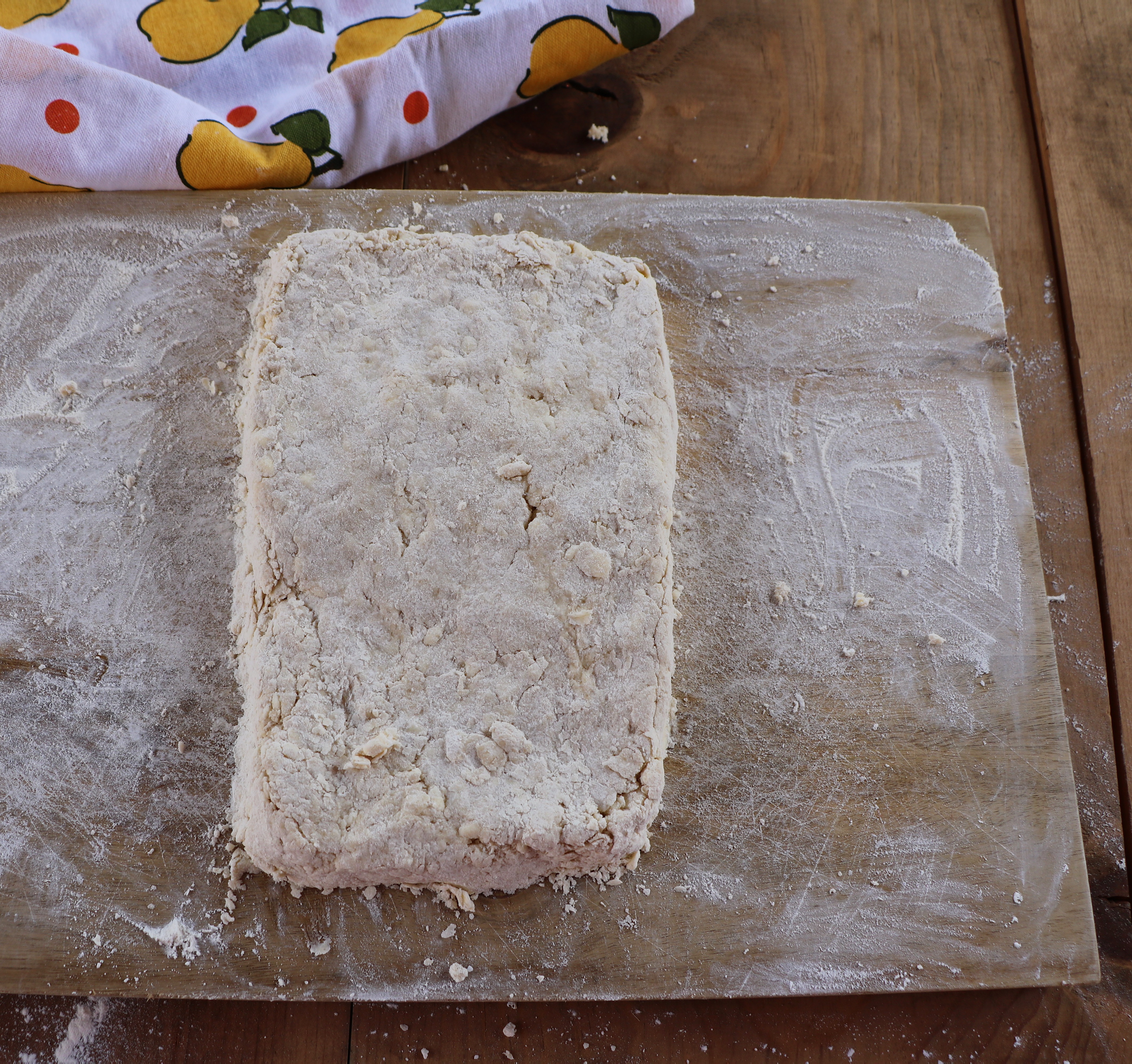 I tried using biscuit cutters, rolling pins, shredding frozen butter with a cheese cutter (disaster) and different kinds of flour.  In the end, I found that keeping the ingredients very cold and handling the dough very little was the way to go. I borrowed a technique from Bon Appetit magazine that involves stacking the dough, leveling it and cutting it into squares.