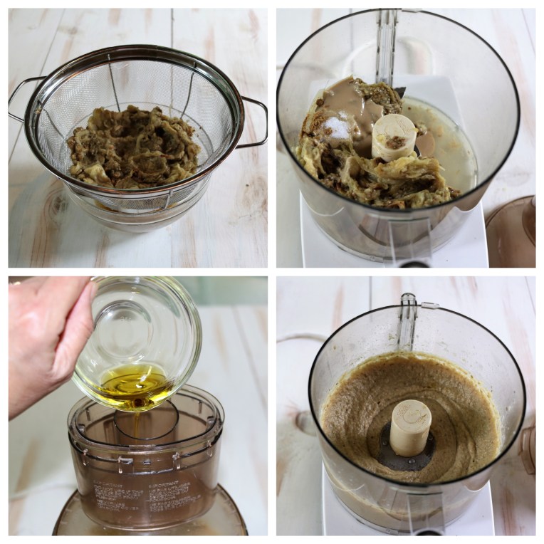Let the eggplant cool for a few minutes, scrap out the flesh into a colander. Place the colander over a bowl. Smoosh it down and let it sit for 5 to 7 minutes. Discard the water in the bowl. Place the eggplant in a food processor. Add the lemon juice, tahini, salt and cumin.