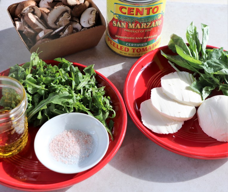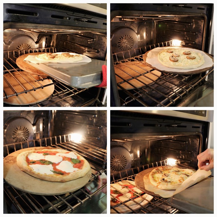 Above are some toppings and below are some suggestions. Anything goes: figs, Italian cured meats, etc. I’ve even had Neapolitan pizza finished with honey and hot paper flakes, But remember, less is more to avoid a soggy pizza. After putting the toppings on, use the upside down baking sheet as a transportation vehicle, and slide each pizza onto the top of a pizza stone or upside down sheet pan, parchment paper and all.