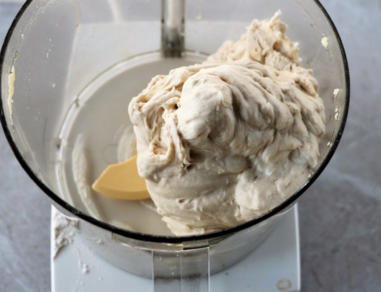 Continue running the food processor for 2 to 3 minutes. The dough will clear the sides of the bowl and look smooth. If it doesn’t clear sides of the bowl, sprinkle just a bit of flour in until it does.