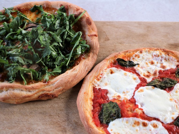 I’m sharing Vigliotti’s recipe for the home cook below. Since regular ovens only get up to about 500 degrees Fahrenheit- not the 900 to 1000 of a wood fired pizza oven- this recipe includes oil to achieve a crispy yet soft and airy crust. However, the real keys are using Caputo 00 flour (which I ordered on Amazon), making the dough a couple days before you use it, and letting the dough and toppings come up to room temperature before you assemble a pizza and bake it.