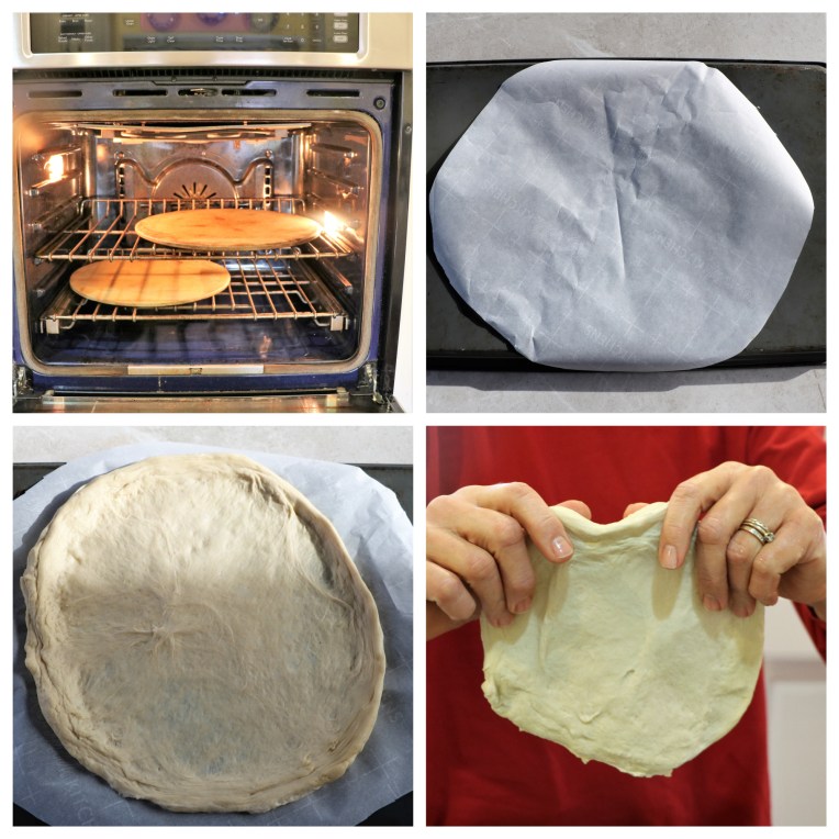 Place either a pizza stone or an upside down baking sheet in the oven while it is preheating. I used two pizza stones, one on the left side of the bottom oven rack and one on the right side of the top oven rack.