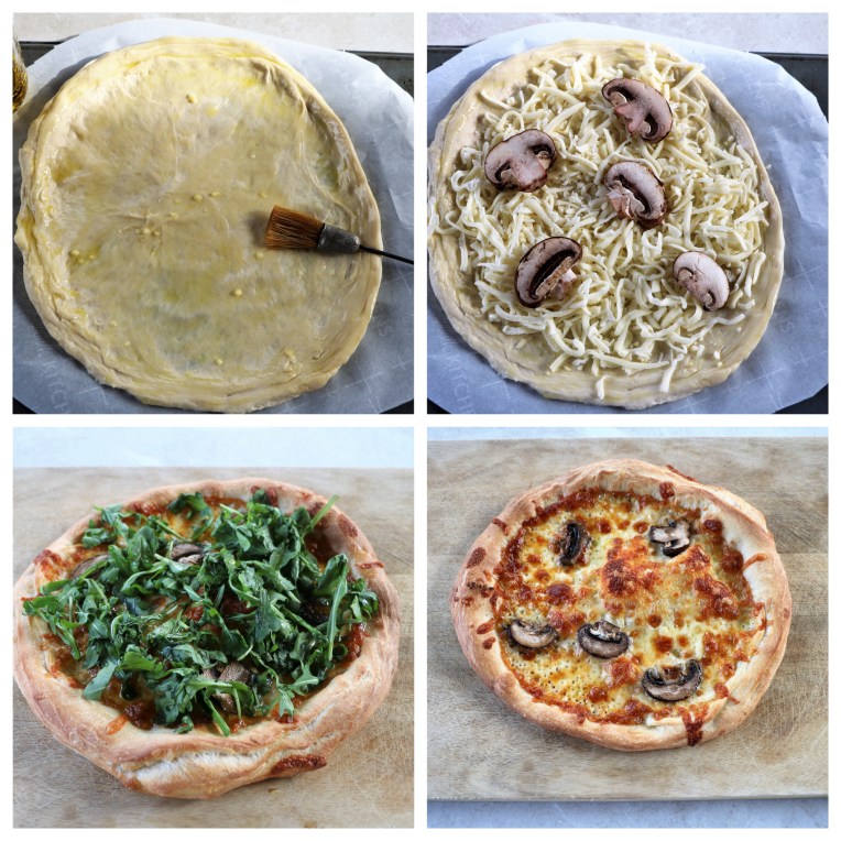 After removing from oven, put 1/2 cup arugula over the top.