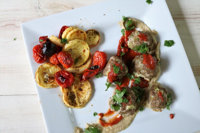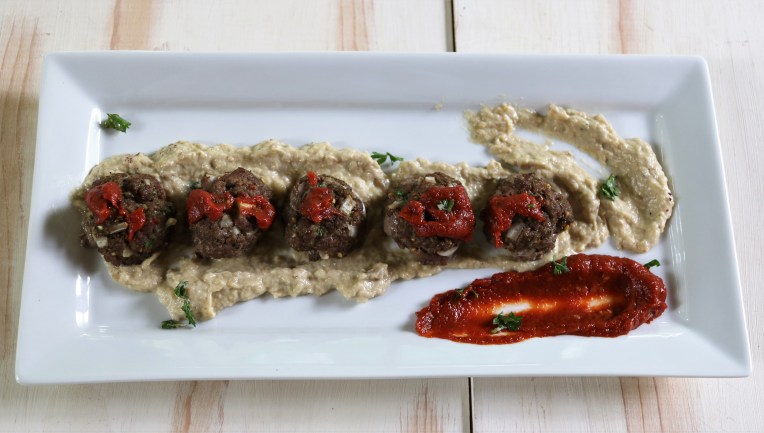 I sure wish this photo looked as good as these meatballs taste! They are delicious made with ground beef or chicken, but are fabulous if it’s possible to get a hold of some lamb. While Jenn was staying with us during the COVID shutdown, she and I had a wonderful time cooking up all kinds of fun things. She came up with the idea of combining baba ganoush and harissa sauce to complement the meatballs. Truly an inspiration!